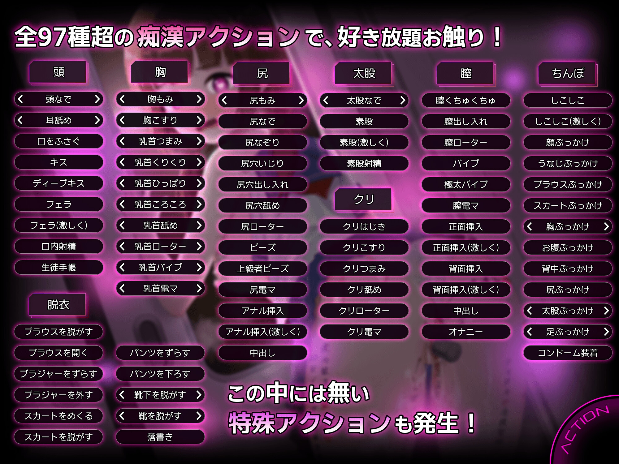 ◆豊富な痴○アクション ◆バレやすさも様々 ◆Live2Dによるフルアニメーション ◆少女Hのボイスはフルボイス ◆電車内の状況変化 WAVE4:禁断のWAVE ◆自由なカメラ操作 ◆ストーリー