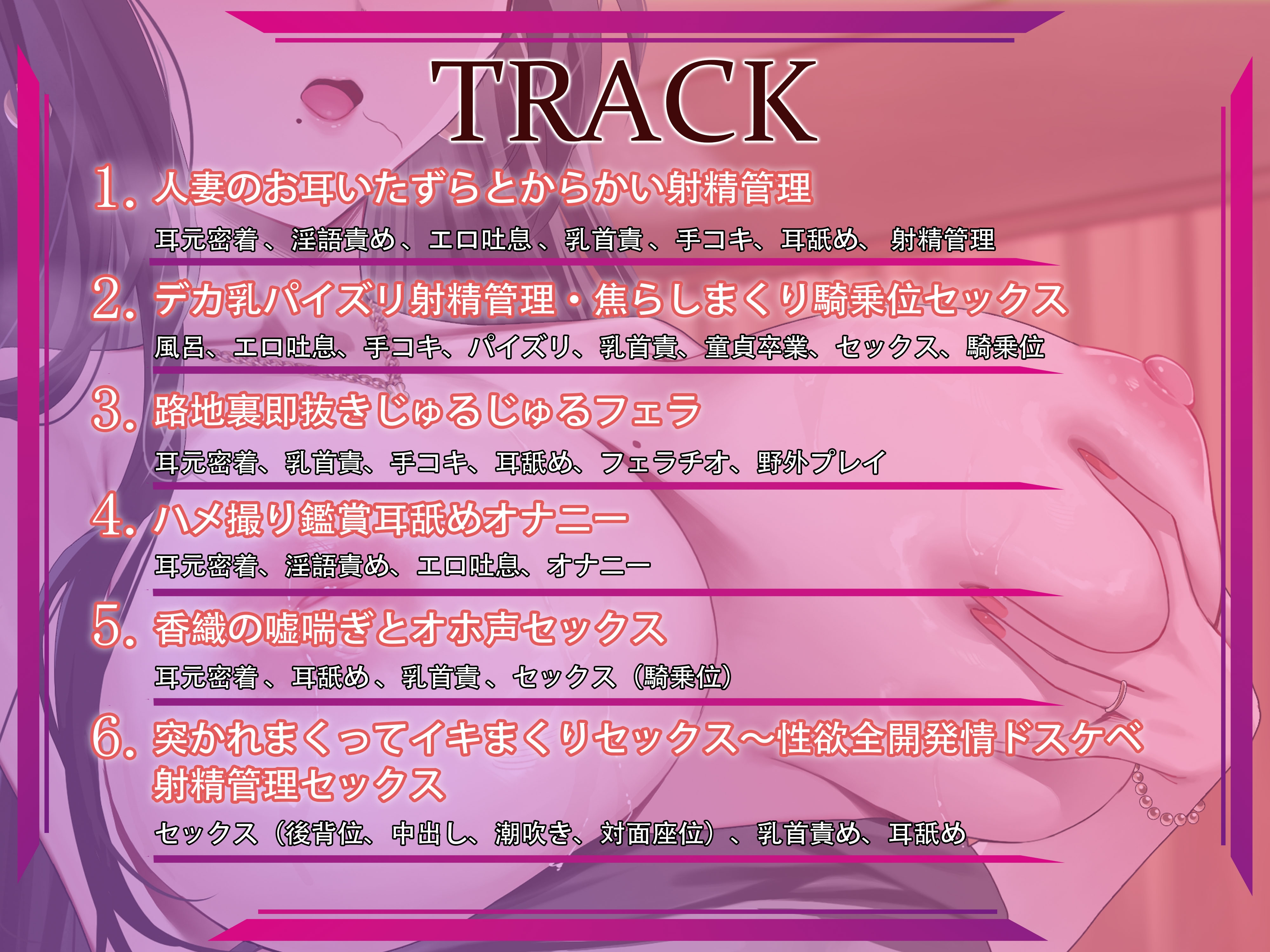 ・トラック1:人妻のお耳いたずらとからかい射精管理 ・トラック5:香織の嘘喘ぎとオホ声セックス ◆購入特典◆◆Tracklist◆