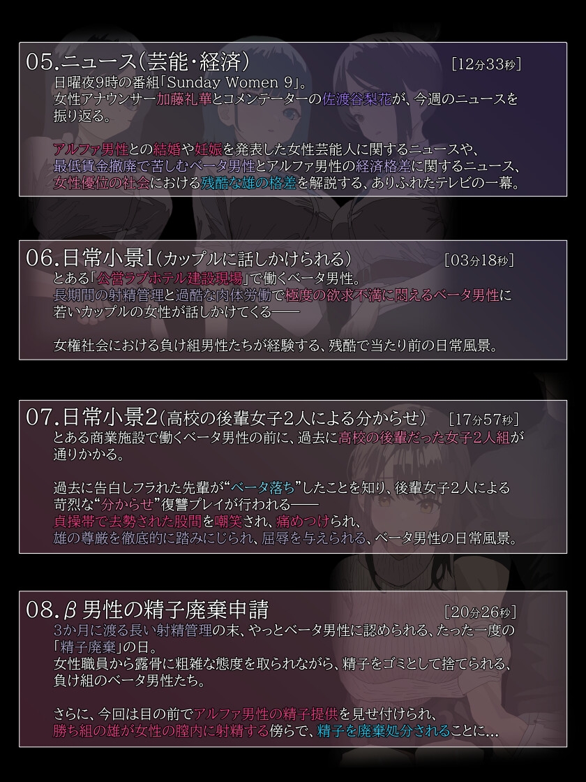 上位3.5%の優秀なアルファ男性がすべての雌と独占的にセックス・子作りを行う一方で、劣等なベータ男性たちには『セックス禁止』『貞操帯着用の義務化』『吐精は3か月に1度だけ』といった厳しい規制が課せられていた。