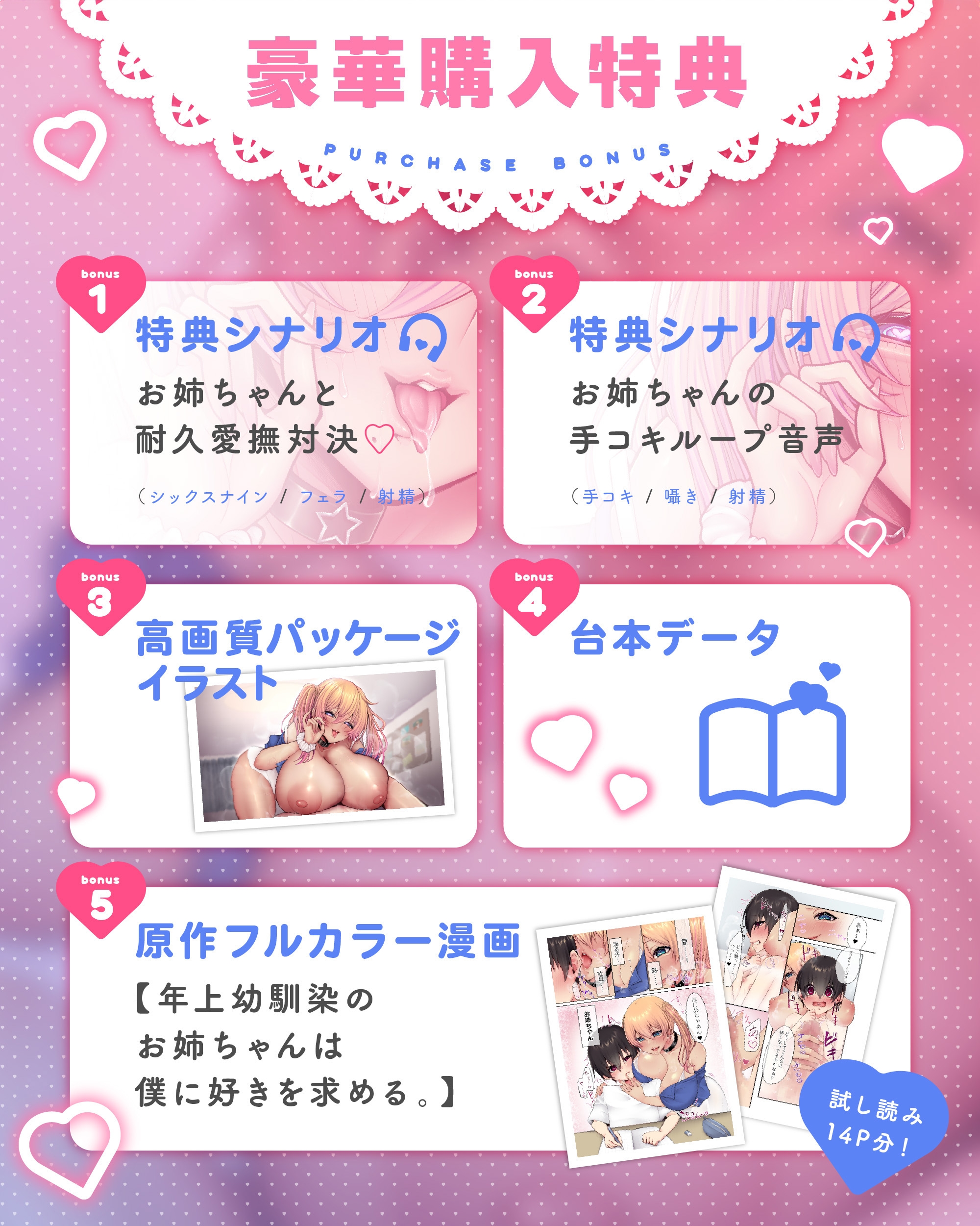 - 作品タイトル: 《好き♡好き♡》囁きお姉ちゃんの中出し射精管理~とろとろ限界おちんぽのご褒美は濃密あまあまH♡【年上幼馴染のお姉ちゃんは僕に好きを求める。ASMR】