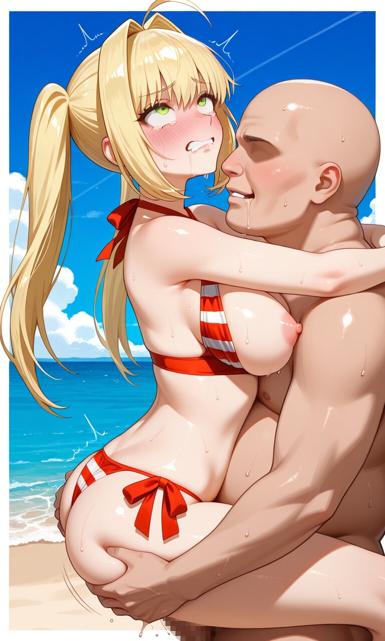 ネロ・スカサハ ・宮本武蔵・牛若丸(全員水着Ver.)のフルカラー、 挑発顔・アヘ顔の表情を中心に、挑発・スパンキング・わからせ・お漏らし(失禁)・搾精、フェラ・イマラ、パイズリ・中出しと多彩なシチュエーションを展開。【F◯te/Grand ●rder】