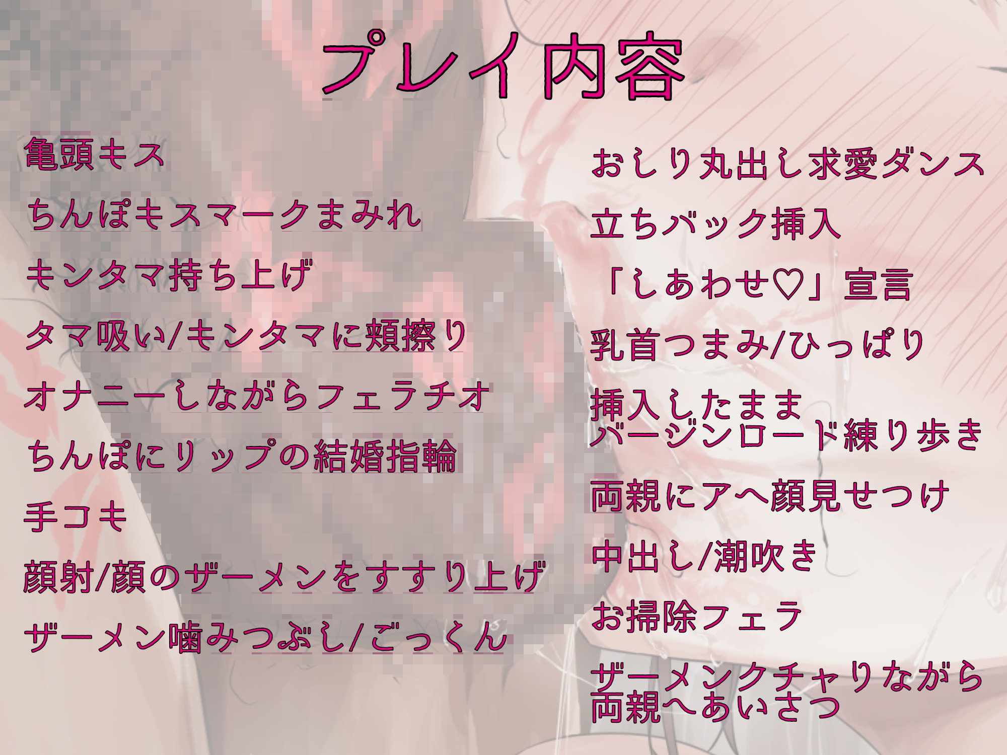 おしり丸出し求愛ダンス/ちんぽと結婚宣言/立ちバックで挿入/乳首こねこね・引っ張り/しあわせ潮吹き/立ちバックでバージンロード練り歩き/両親に下品な姿見せつけ/新郎新婦同時イキ/精子まみれちんぽ顔に塗りつけ/お掃除フェラ/精子嚙みつぶし/精子クチャりながら両親にあいさつ